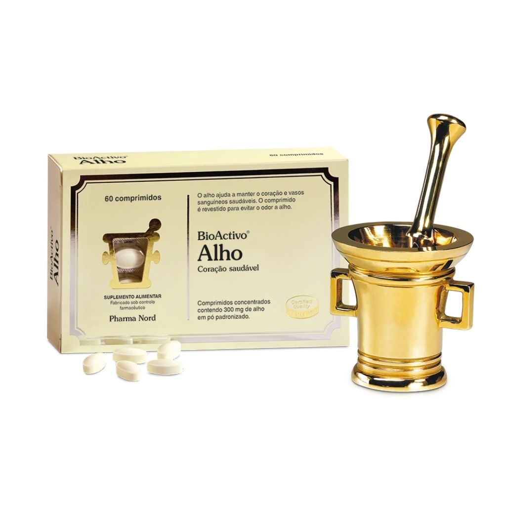 Suplemento alimentar Bioactivo Alho, concebido para apoiar a saúde cardiovascular e o sistema imunitário.