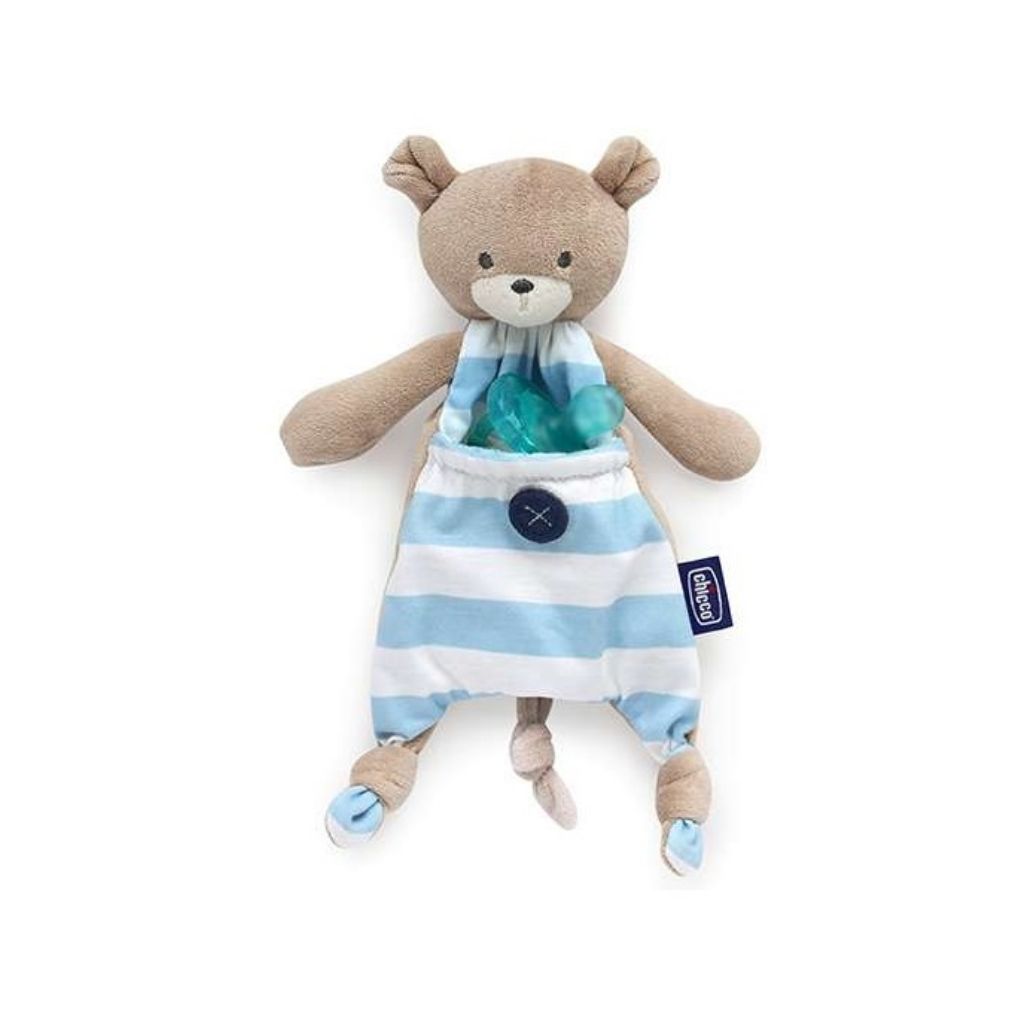 Guarda-chupeta macio e divertido Chicco, ideal para bebés desde o nascimento, que facilita o armazenamento e transporte da chupeta.
