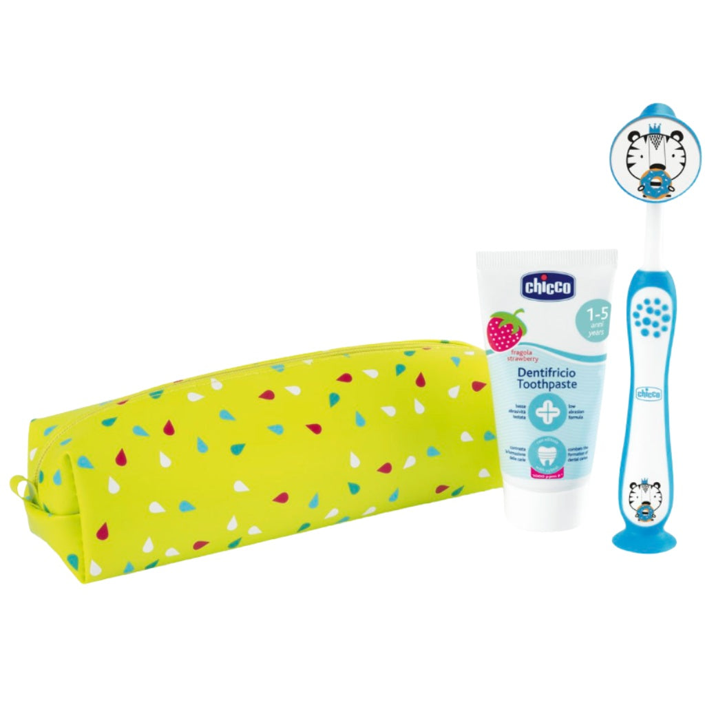O conjunto inclui uma pasta de dentes com sabor a morango, tornando o momento da escovagem mais agradável. Tudo vem acondicionado num divertido estojo que permite guardar e transportar facilmente o conjunto de higiene oral.