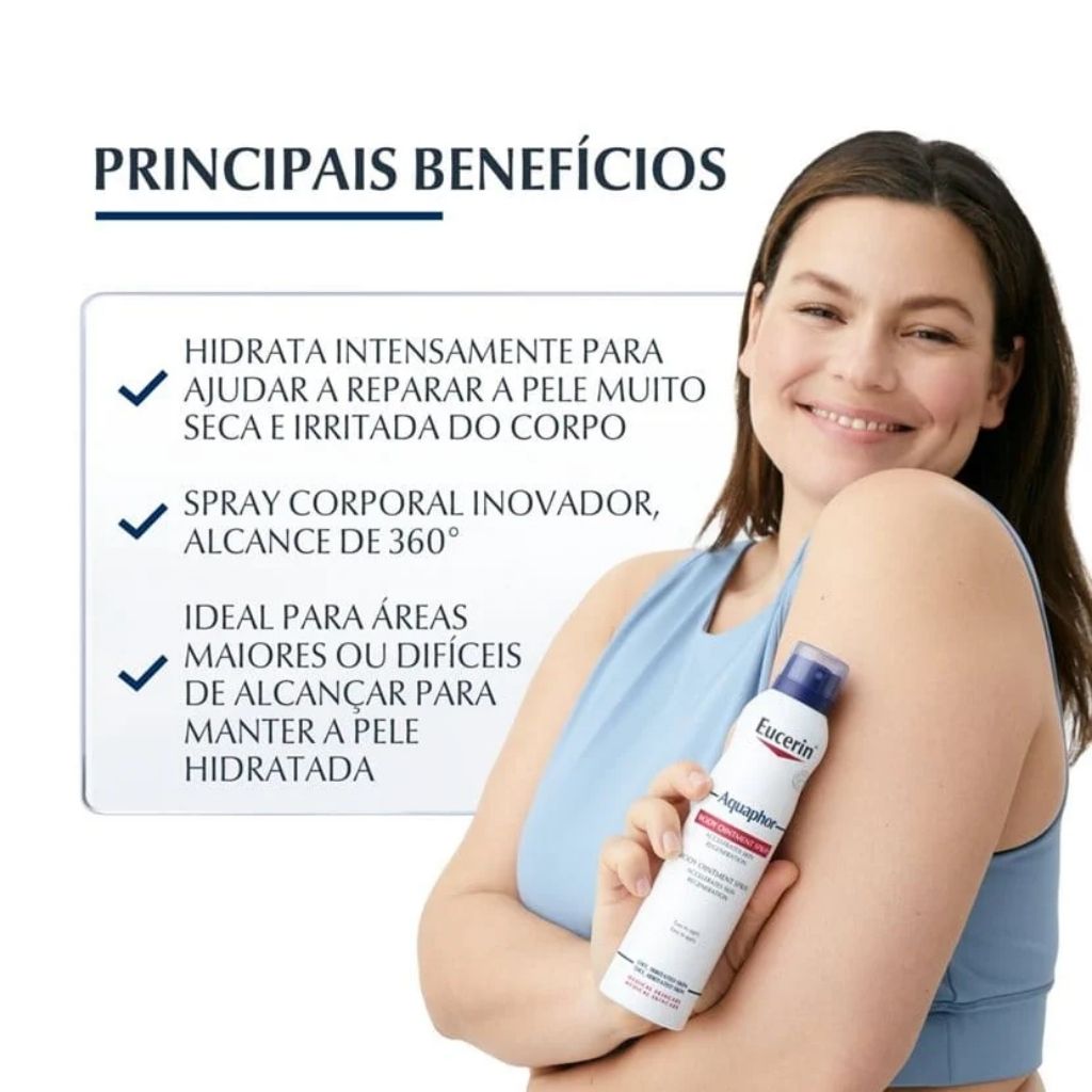 Eucerin Aquaphor Spray é um hidratante em spray indicado para pele seca e áspera, proporcionando alívio e suavidade de forma prática e rápida.