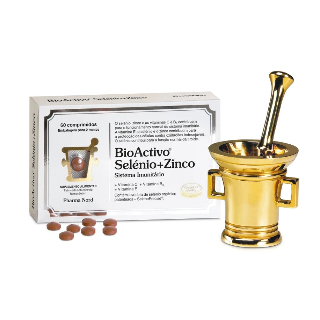 Suplemento alimentar Bioactivo com selénio, zinco e vitaminas, indicado para apoiar o sistema imunitário e a saúde geral.