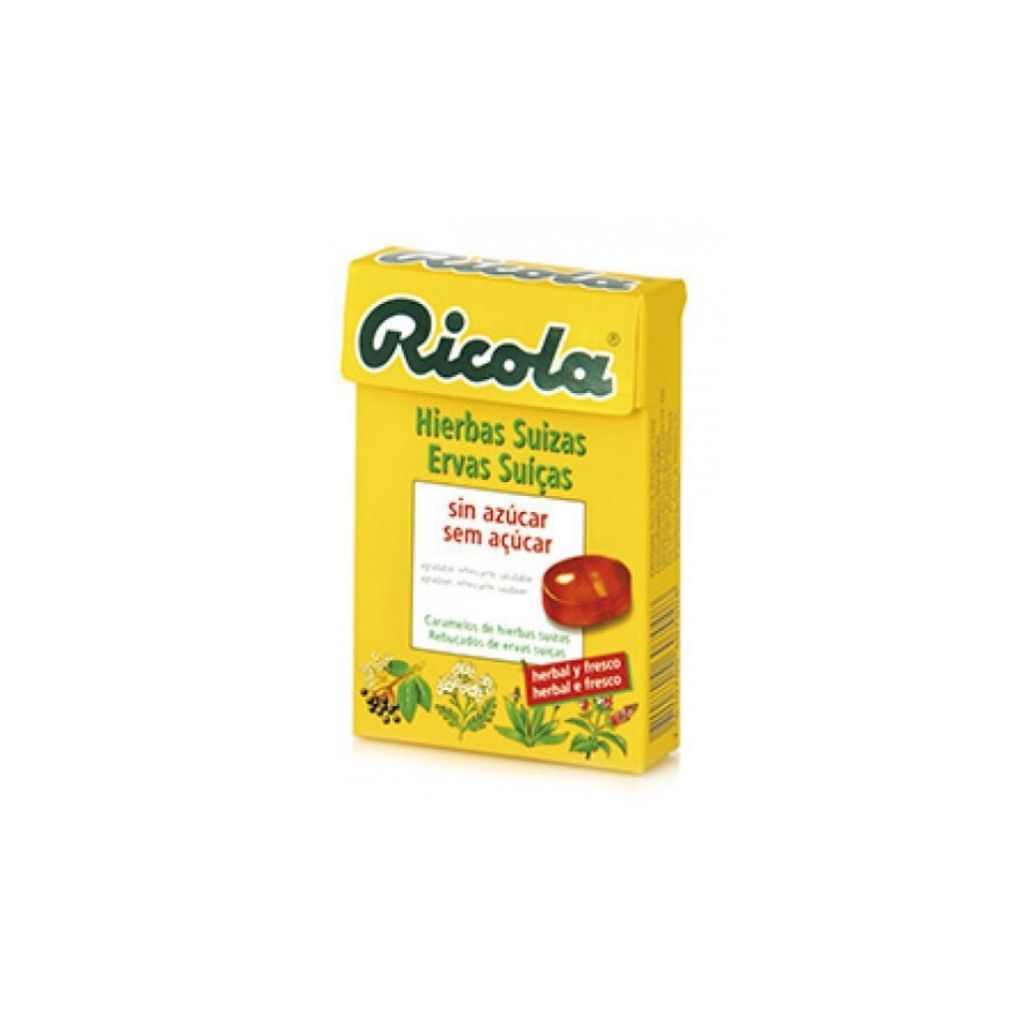 Rebuçados Ricola de ervas suíças, ideais para suavizar e refrescar a boca e garganta, com um sabor agradável e sem açúcar.
